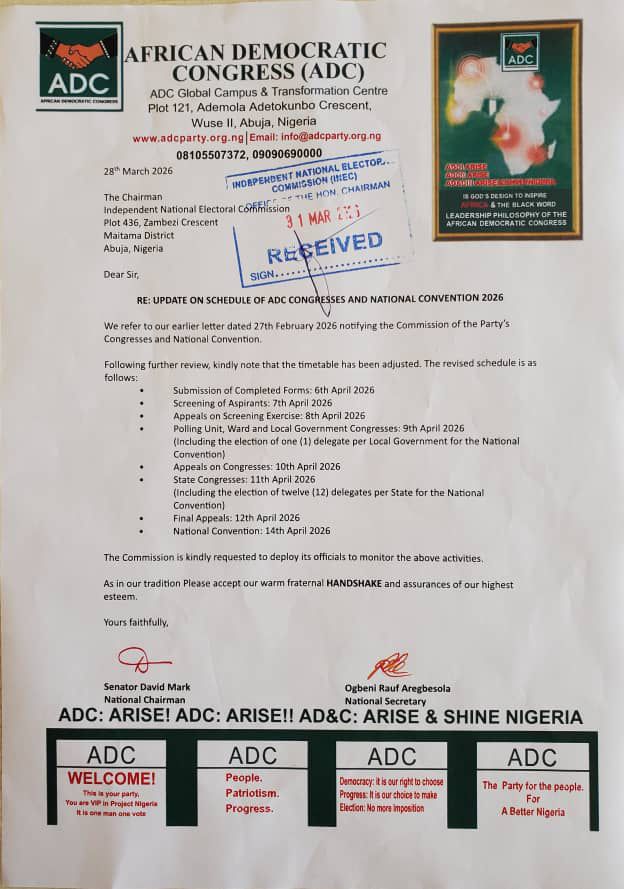 The Independent National Electoral Commission (INEC) has on Tuesday, March 31, 2026; confirmed invitation to be a part of the David Mark-led ADC congresses and convention.
