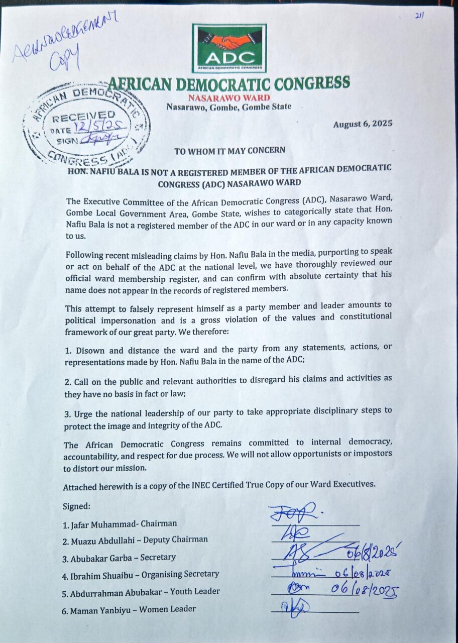 The African Democratic Congress (ADC) in Gombe State has clarified that Nafiu Bala is not a registered member of the party.