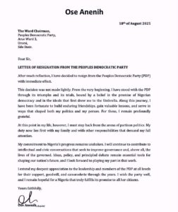 “This decision was not made lightly,” he wrote, recalling his long commitment to the PDP since its founding. While grateful for his years of service, he explained that he is stepping back from partisan politics to prioritize family and other responsibilities.