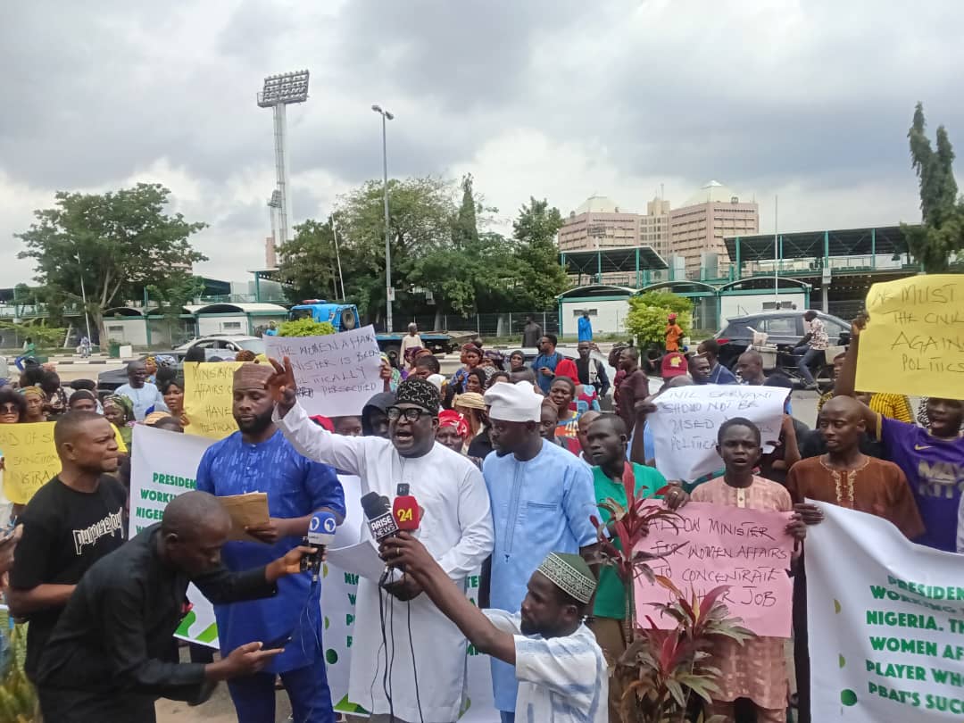 Scores of demonstrators on Friday marched from the National Assembly to the Office of the Head of the Civil Service of the Federation, protesting what they described as harassment of the Minister of Women’s Affairs, Imaan Sulaiman-Ibrahim.
