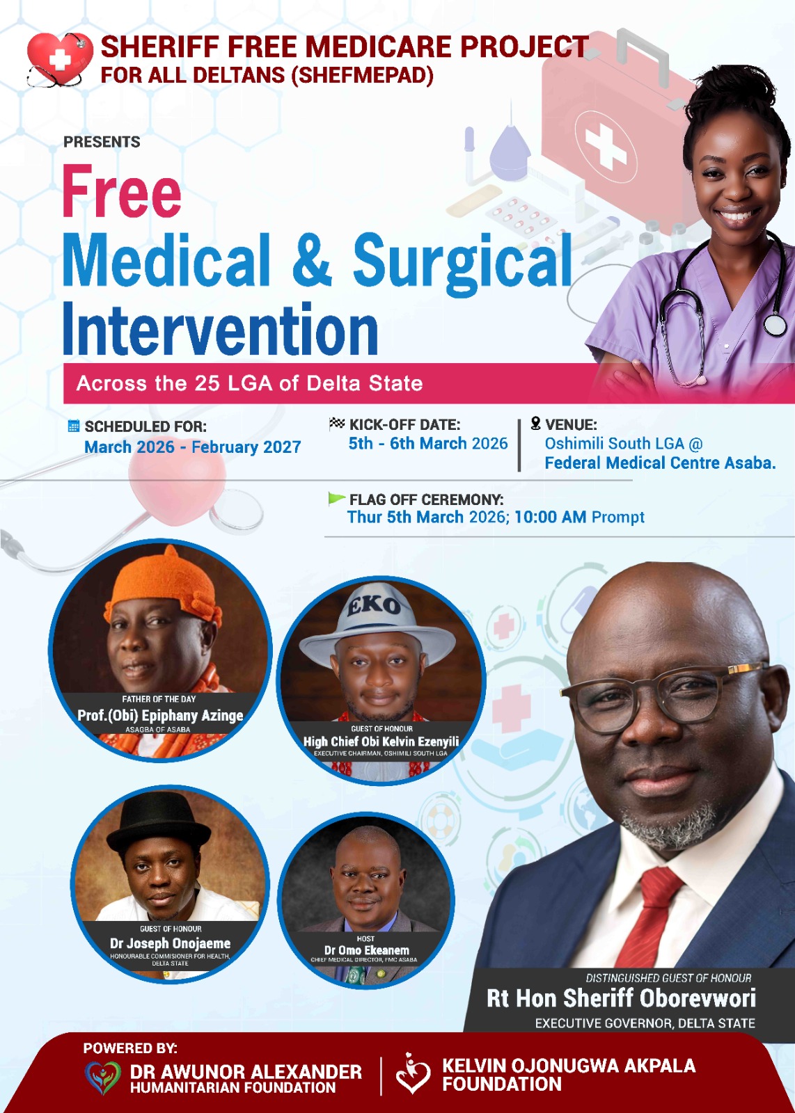 The SHEFMEPAD free medical and surgical intervention programme is powered by the Dr. Awunor Alexander Humanitarian Foundation and the Kelvin Ojonugwa Akpala Foundation, in partnership with the Delta State Government.